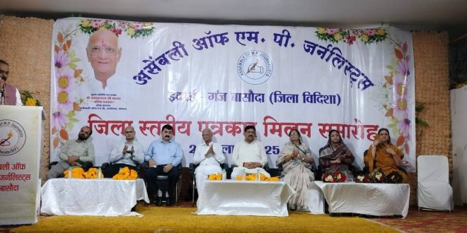 गंजबासौदा – गंज बासौदा के दाद्जी प्लाजा सभागार कक्ष में रविवार को असेंबली ऑफ़ एमपी जर्नलिस्टस का जिला स्तरीय पत्रकार मिलन समारोह संपन्न हुआ। जिसमें जिले की विभिन्न तहसीलों से पधारे पत्रकारों एवं पत्रकारिता से जुड़े हुए लोगों ने सहभागिता की। कार्यक्रम में विशेष आमंत्रित अतिथि माननीय प्रथम जिला न्यायाधीश एवं गंजबासौदा न्यायालय के द्वितीय श्रअतिरिक्त न्यायाधीश व विधिक सेवा समिति के अध्यक्ष अनुराग द्विवेदी एवं सिविल जज रावेंद्र सोनी, मुख्य अतिथि यूनियन के प्रदेश अध्यक्ष एवं वरिष्ठ पत्रकार राधावल्लभ शारदा मौजूद रहे। कार्यक्रम की अध्यक्षता क्षेत्रीय विधायक हरि सिंह रघुवंशी, विशिष्ट अतिथि नगर पालिका अध्यक्ष श्रीमती शशि अनिल यादव, जनपद अध्यक्ष श्रीमती नीतू देवेंद्र रघुवंशी, अनुविभागीय अधिकारी (राजस्व) विजय राय, पूर्व विधायक श्रीमती लीना जैन, संगठन के प्रदेश महासचिव माखन विजयवर्गीय की उपस्थिति एवं संवोधन के साथ संपन्न हुआ। कार्यक्रम का शुभारंभ आमंत्रित अतिथियों द्वारा माता सरस्वती चित्र के समक्ष दीप प्रज्वलन कर किया गया। इसके पश्चात आमंत्रित अतिथियों का स्वागत व सम्मान, पत्रकार संगठन के सदस्यों द्वारा पुष्पहारों एवं पुष्प गुच्छ भेंट कर किया गया। स्वागत उद्बोधन यूनियन के सचिव माधव शर्मा ने प्रस्तुत किया। इसके पश्चात अतिथियों ने कार्यक्रम में उपस्थित पत्रकारों और गणमान्य नागरिकों को संबोधित किया।