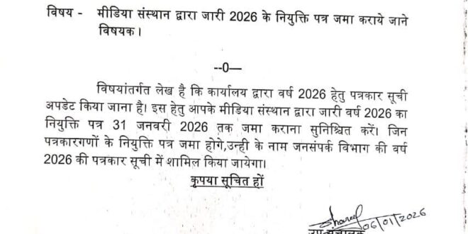 मध्यप्रदेश सरकार के जिला जनसंपर्क विभाग ने सभी पत्रकारों को 31 जनवरी के पूर्व जिस मीडिया संस्थान में कार्यरत हैं उस संस्थान का नियुक्ति पत्र देना होगा।